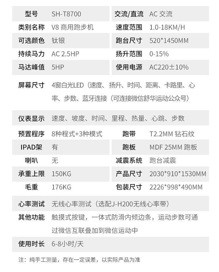 舒華商用跑步機(jī)SH-T8919采用t2.2mm黑鉆紋(可選配:t2.4免維護(hù)跑帶)的跑帶,,選用手握心率測試 自帶心率帶及增加心率控速(HRC)程序模塊、接觸式心率感應(yīng)測量心跳等數(shù)據(jù),跑步面積達(dá)580×1570mm,可承受180kg的使用者使用。