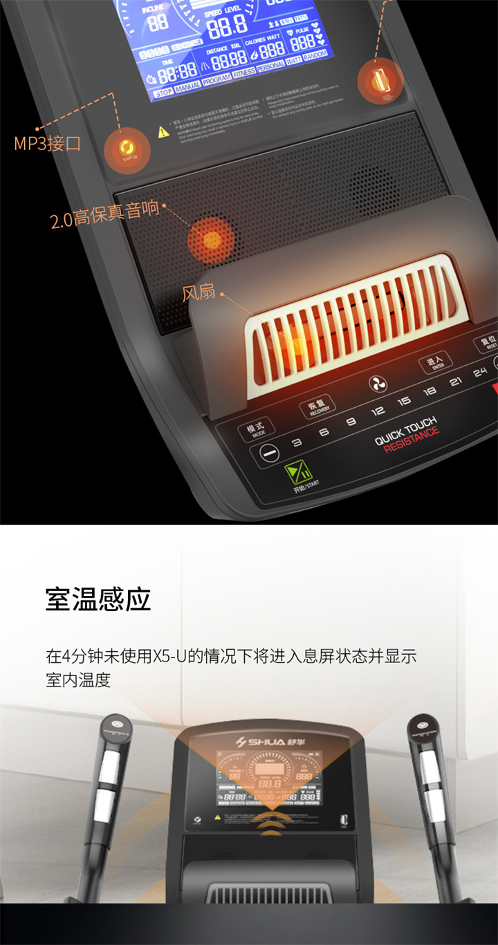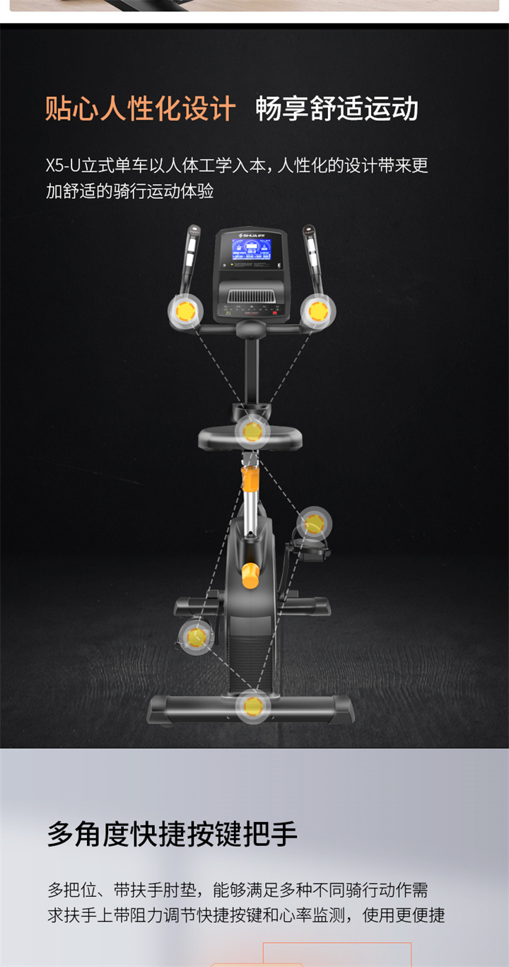 舒華立式商用健身車SH-B9100U(V10)觸屏版擁有超大顯示和操作屏幕, 可以任意設置阻力、時間和距離等參數(shù),還可以即時顯示心跳和轉速等數(shù)據(jù),同時,SH-B9100U提供多項科學運動處方,更輕松掌握運動節(jié)奏。